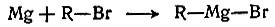 Если стружки магния залить в колбе совершенно сухим эфиром и постепенно прибавлять в колбу какое-нибудь органическое соединение, содержащее галоген, то магний растворится, получится бесцветный прозрачный раствор. Образуется так называемый реактив Гриньяра. Его строение можно записать так:
