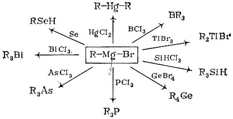 Очень много внимания уделяют химики металлов органическим производным ртути, которые можно получить через уже известные нам реактивы Гриньяра. Впрочем, от магнийорганических соединений можно перейти к производным многих других металлов, да и неметаллов, как показано на схеме. Мы расскажем только о некоторых самых "знаменитых".
