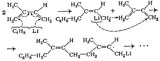 Второй пример, когда металлоорганическое производное образуется на промежуточных стадиях реакции полимеризация непредельных соединений- Именно полимеризацией бутадиена под действием натрия был получен первый советский синтетический каучук (1930 г.). Руководил этой работой выдающийся химик-органик С. В. Лебедев.