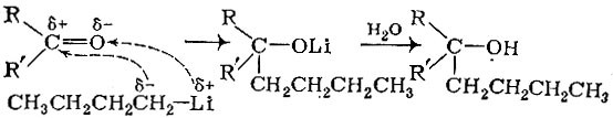 Металлоорганические соединения элементов I группы (в практике чаще всего применяют производные лития) присоединяются не только к углерод углеродной двойной связи. Охотно реагируют с металлов органическим производным натрия или лития органические соединения, содержащие карбонильную, нитрильную и другие группы. Вот как ревгирует бутиллитий с кетоном: