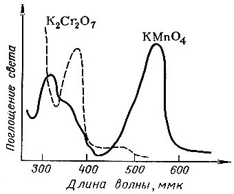 Если через растворы марганцовокислого калия или двухромовокислого калия пропустить пучок белого света, то эти растворы поглотят из него лучи только определенного цвета