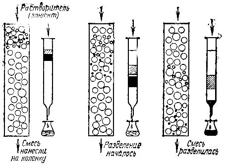 разделения, когда разделяемые вещества отличаются друг от друга способностью сорбироваться твердым носителем. Возможны и другие принципы разделения, например, основанные на различиях в растворимости, прочности связей, образуемых разделяемыми веществами и некоторыми носителями, например, ионообменными смолами. Важная ветвь хроматографии гель-фильтрация основана на том, что раствор, содержащий вещества различной молекулярной массы, пропускают через колонку с пористыми зернами геля. При этом крупные молекулы, не умещающиеся в порах, проходят свободно между зерен, а мелкие задерживаются гелем, Именно так проводят разделение и очистку белков.