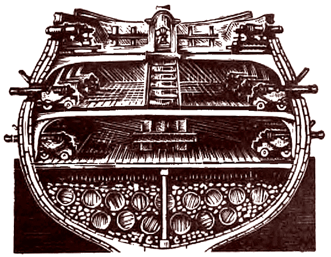 По количеству деков с орудиями, не считая верхней, открытой, палубы, военные корабли разделялись на двух- и трехдечные. Третья, закрытая, орудийная палуба называлась гон-дек. Под гон-деком находился орлоп-дек, или трюм, где хранились продукты и в специальном кормовом помещении крюйт-камере бочонки с порохом и снаряды. В крюйт-камеру опускались по лестницам-трапам через люки в палубах.