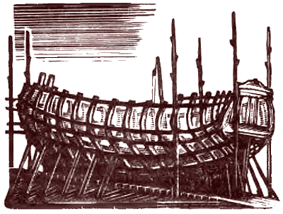 К килю крепят боковые ребра шпангоуты. Между собой шпангоуты скрепляют продольными брусьями стрингерами. Противоположные ветви шпангоутов связывают друг с другом поперечными балками бимсами. На бимсы настилают палубу. Сверху на концы бимсов устанавливают мощный брус ватервейс. По длине ватервейса делают косые прорези для стока воды с палубы шпигаты. Чтобы палуба не прогибалась от груза, под бимсы изнутри судна подводят подпорные стойки пиллерсы. Верх палубы от борта надстраивают фальшбортами. Фальшборт служит для того, чтобы люди и груз во время качки не скатились с палубы в море.