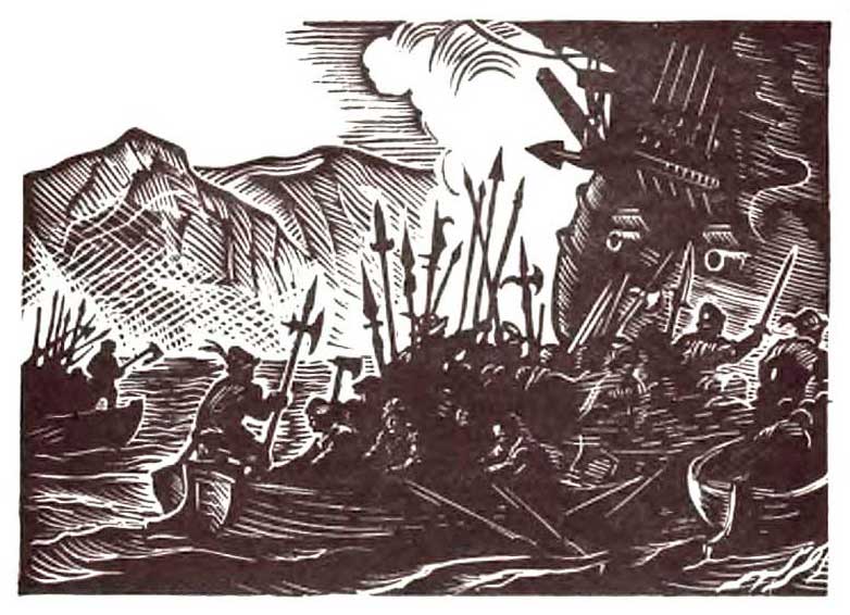 Первыми ударили из сотни пушек корабли капудана. Почти в ту же минуту борта русских кораблей как бы раскололись вдоль огненно-дымной чертой. Свистящая картечь рванула турецкие паруса. «Владимир» огнем всех стволов правого борта громил флагман Гассана. Чтобы огонь был непрерывным, Поль Джонс приказал стрелять поочередно: сначала орудия нижнего гон-дека, затем залп среднего мидель-дека и, наконец, легкие пушки опер-дека. Тем временем артиллеристы успевали перезарядить первый ряд карронад, и все начиналось сызнова.