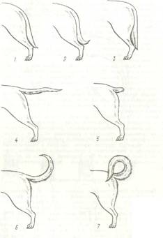 Хвост в совокупности с другими статями является признаком породной принадлежности собаки. С помощью хвоста собака обеспечивает сбалансированность движений и выражает свое эмоциональное отношение к различным объектам и ситуациям. По форме хвост бывает опущенный (саблевидный, крючком, поленом), поднятый (прутом, серпом, кольцом) и купированный (отрезанный) в соответствии с требованиями стандартов (рис. 15). По длине хвост может быть коротким, если он не доходит до скакательных суставов, и длинным ниже скакательных суставов.