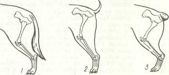 При осмотре собаки сбоку можно наблюдать отклонения в поставе бедра, голени и плюсны (рис. 20). Прямой постав задних конечностей бывает при отвесном положении бедра и голени, вследствие чего углы коленного и скакательного суставов выпрямлены. Саблистость задних ног встречается при слишком косом положении бедер и голеней и при наклонно поставленных плюснах. Саблистая постановка связана со слабостью скакательных суставов, образующих острые углы.