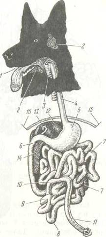 Желудок собаки сравнительно (по отношению к массе тела) объемист и в этом отношении превосходит желудки других домашних животных. Выход из него закрывается специальными кольцевыми мышцами сфинктерами, работа которых регулируется нервной системой. Как только пищевая масса полностью обработана в желудке, сфинктер рефлекторно открывается и с помощью сокращения мышц желудка пища эвакуируется в тонкий отдел кишечника, который состоит из 12-перстной, тощей (самой длинной) и подвздошной кишки. Вся внутренняя поверхность слизистой оболочки этого отдела негладкая, покрытая ворсинками, в основании которых располагаются отверстия микроскопических желез, выделяющих в просвет кишки кишечный сок. В 12-перстную кишку открываются, как мы уже говорили, еще и протоки поджелудочной железы и печени. В этой части кишки идет самое интенсивное переваривание и всасывание в кровь или лимфу питательных веществ.