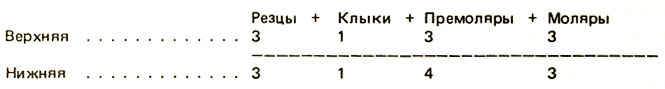 Согласно толкованию французского стандарта, которое я также считаю правильным, так как оно анатомически обосновано, у собаки должно быть на верхней челюсти 6 резцов, 2 клыка, 6 премоляров, 6 моляров (при этом первый большой моляр назван "хищным зубом" - "carnissaire"); на нижней челюсти 6 резцов, 2 клыка, 8 премоляров, 6 моляров. Таким образом, зубная формула одной стороны челюстей выглядит так: