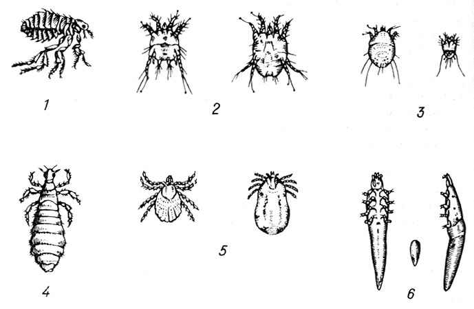 Рис. 33. Некоторые внешние паразиты собак (клещи очень сильно увеличены) : 1 - собачья блоха; 2 - зудневый кожный клещ (самец и самка) ; 3 - саркоптовый клещ (самец и самка) ; 4 - собачья вошь; 5 - клещ иксодовый; 6 - клещ демодекс (вид самца снизу и сбоку, в центре - самка)