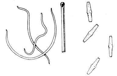 Рис. 34. Круглые глисты (слева) и членики ленточных глистов (справа), в центре для масштаба - спичка