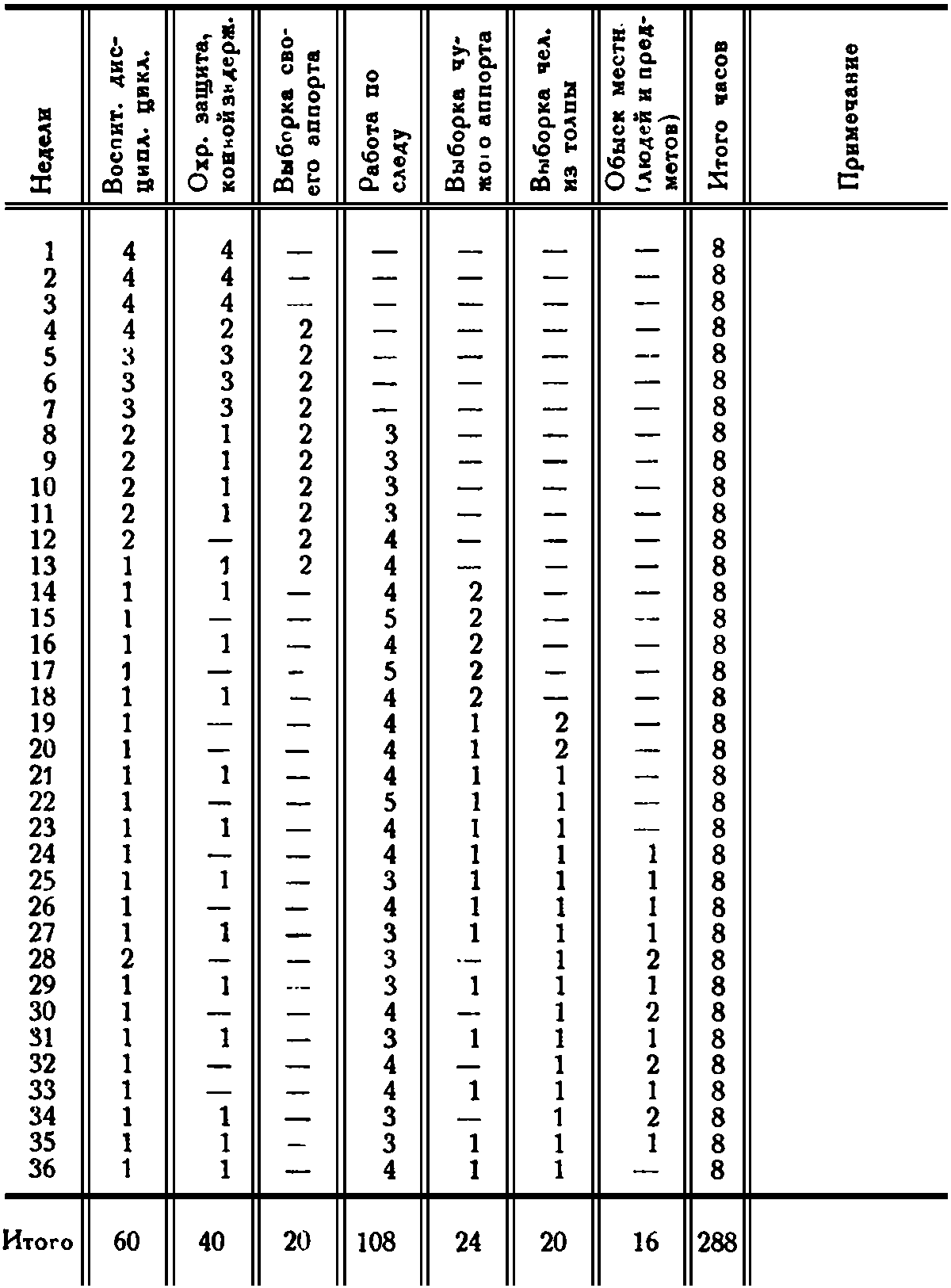 Примерный курс обучения собаки рассчитан на 6 месяцев 36 пятидневок. Ежедневно предполагается работать с собакой по 2 часа, а всего за курс 4×2×36=288 уч. часов (см. схему).