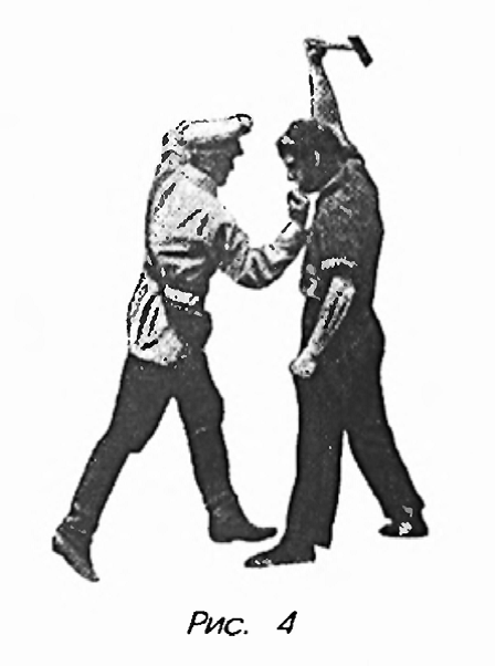 наносимый согнутой крюком рукой снизу вверх в челюсть или под ложечку противника. Из основной стойки, показанной на рис. 4, рука, согнутая в локте под прямым углом, резко выносится вперед-вверх. Для усиления удара туловище (до этого момента несколько согнутое вперед) резко выпрямляется и слегка поворачивается правым плечом вперед. Пальцы кулака обращены на себя.