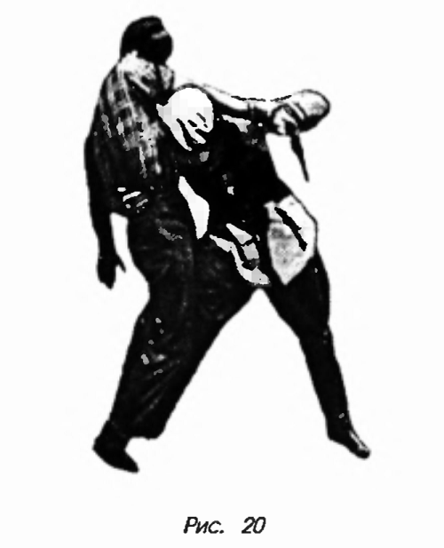 В этом случае рука противника всегда будет повернута ладонью внутрь, то есть к голове и, следовательно, разгибаясь, окажется ладонью вверх: как раз в том положении, которое нужно для описываемого приема. Вам нужно захватить руку противника в тот момент, когда она поднята, причем ладонь захватывающей руки должна быть повернута не внутрь, а наружу (рис. 19 и 20).