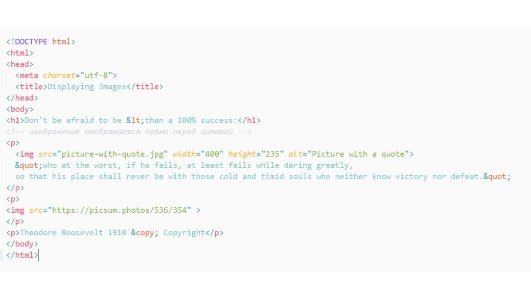 И вы можете заметить, что этот URL-адрес ничем не отличается от href, который вы видели у тега ссылки . Это может быть относительный URL-адрес или абсолютный URL-адрес, если он содержит внешнюю ссылку. Далее мы указываем ширину и высоту изображения. Хотя это и не обязательно, рекомендуется всегда указывать ширину и высоту. И еще есть атрибут alt, который используется программами чтения с экрана, помогающими людям с нарушениями зрения.Как вы видите, это изображение отображается в браузере в одной строке с текстом, так как тег img является встроенным элементом. Если бы это было не так, изображение было бы на своей собственной строке. Теперь давайте посмотрим на другой тег img. Здесь используется внешняя ссылка, указывающая на изображение в Интернете. И здесь не указана высота и ширина изображения. Поэтому оно будет отображаться со своими изначальными размерами. И если эти размеры очень большие, изображение может занять всю вашу HTML страницу, не оставив места для остального контента. Вот почему рекомендуется указывать высоту и ширину изображения. И еще, если для загрузки изображения требуется время, страница может дергаться во время загрузки. Но если вы используете ширину и высоту изображения, вы говорите браузеру, чтобы он зарезервировал пространство для изображения и загружал его в эту область. Тогда страница не будет дергаться.Вы