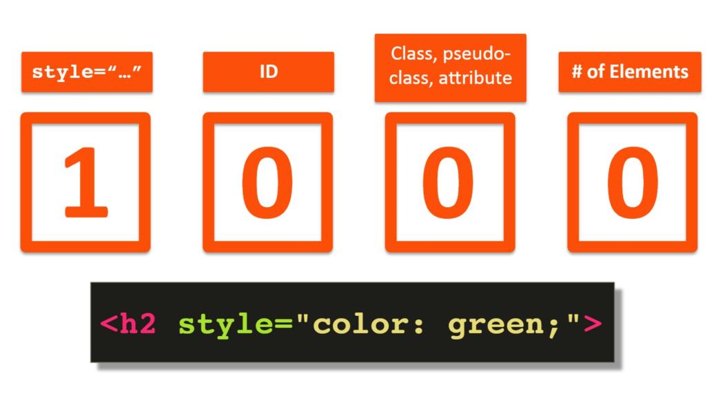 Самое высшее значение специфичности имеет атрибут стиля элемента style. И это происходит, когда вы указываете объявления CSS прямо в элементе, используя атрибут стиля. Нет ничего более конкретного, чем это объявление.