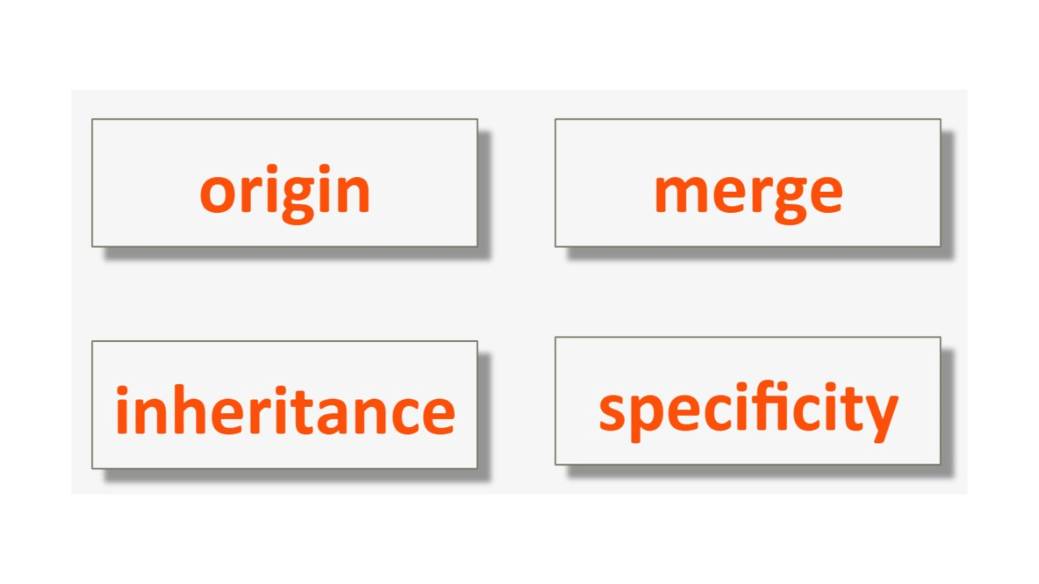 Это происхождение, или приоритет происхождения, слияние, а также наследование и специфичность.
