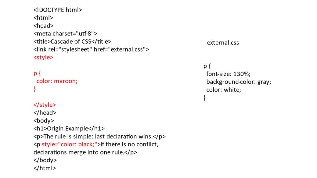 Таким образом, объявления, например, размера шрифта и объявление цвета, так как это два разных свойства, при том, что они определены для одного и того же элемента, и даже если они определены в разных местах, они сольются в одно объявление. И элемент получит как размер шрифта, так и цвет.