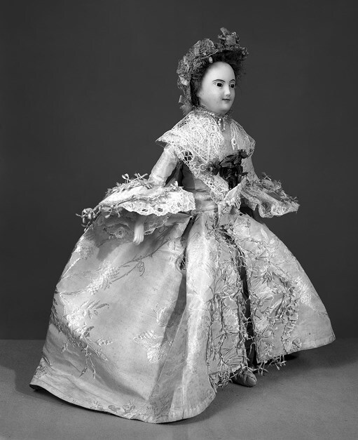 Ил. 2.2. Кукла, одетая в белое шелковое свадебное платье-контуш с узорами и нижней юбкой. Воск, ткань. 1761
