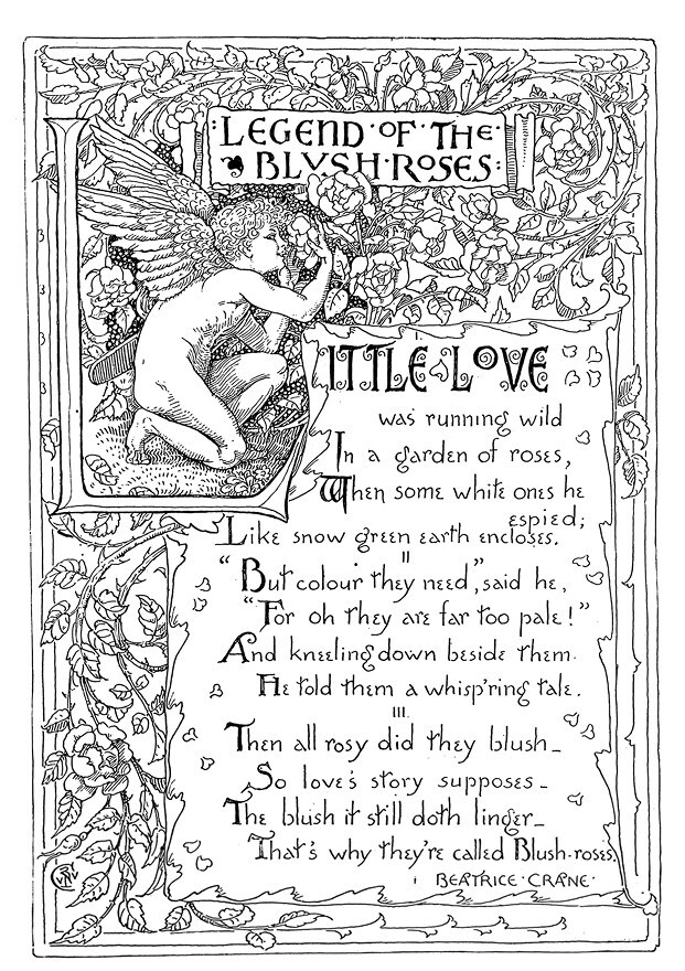 Чтобы найти доказательства этой гипотезы, мы обратились к автобиографии Крейна. Было обнаружено, что как раз во время выхода книги Крейн работал вместе со своей старшей дочерью Беатрис. Он подробно рассказывает, что Беатрис, «несмотря на детский возраст, владела хорошим поэтическим стилем», и сообщает, что однажды Оскару Уайльду, редактору журналов The Womans World и Little Folks, понравилось ее стихотворение «Румяные розы», и «он захотел напечатать его в своем журнале, где оно и появилось вместе с моей иллюстрацией» . Стихотворение было напечатано в журнале The Womans World в 1888 году, менее чем за год до выхода «Праздника Флоры» (ил. 5.5). В стихотворении рассказывается, как несколько роз буквально зарделись от смущения, когда купидон «опустился на колени рядом с ними» и «шепотом рассказал им сказку». В конце говорится, что «румянец доселе длится, поэтому розы зовут румяными» . Несмотря на то, что в стихотворении та же логика, что и в «Празднике Флоры» (цветы наделяются человеческими чертами), на иллюстрациях Крейна просто изображены розы. Поскольку для Беатрис это была первая публикация, Крейн, очевидно, хотел, чтобы на первый план вышли творческие способности его дочери. Дабы не отвлекать читателя, пересказывая историю картинкой, Крейн позволяет тексту Беатрис передать весь смысл. Стихотворение подписано именем дочери, а инициалы самого Крейна незаметно проставлены в левом нижнем углу.