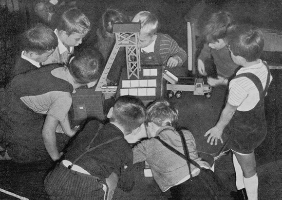 Другая статья в специальном номере Tvar называлась «Значение игрушек для воспитания детей» (Význam hraček při výchově dítěte). Автор статьи Ева Кубиова рассуждает о функции игры, суть которой, с государственной точки зрения, заключалась в подготовке детей к работе. Кубиова пишет, что основная задача игры и игрушки «укрепить ребенка в физическом и интеллектуальном смысле так, чтобы он должным образом вырос в будущего труженика на пользу общества». Особенно важно внимание к игре на ранних стадиях развития ребенка, когда дети любят играть одни. Это время, когда «нужно заботиться о ребенке, чтобы он не вырос индивидуалистом». Текст Кубиовой сопровождали изображения детей, играющих в детском учреждении. Игрушками на этих изображениях были миниатюрные копии станков и заводов. В подписях под картинками подчеркивалась идея о дружном коллективе, главной ценности социалистического человека. Некоторые игрушки именовались «коллективными» к ним, например, относилась игрушечная угольная шахта. На картинке шахта окружена детьми (преимущественно мальчиками), которые пристально рассматривают нечто возле башни, внутри которой можно различить веревку и подъемник (ил. 8.2) . Другие подписи сообщали, что игрушки предназначаются для «детских коллективов». Такая же подпись стояла и под фотографией с одиноким ребенком, завершающим строительство фабрики из деревянных кубиков. Больше никаких замечаний относительно того, как дети играют с игрушками, не было. В своей теории Кубиова ссылалась на лекции советского педагога Макаренко о воспитании детей .