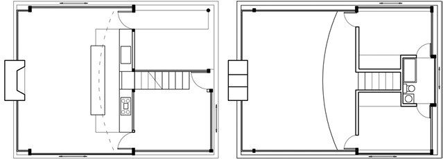 Ил. 9.3. Планировка Дома-Калейдоскопа. Слева: первый этаж с гостиной, столовой, кухней и кабинетом. Справа: верхний уровень с мезонином и спальнями