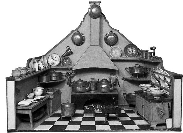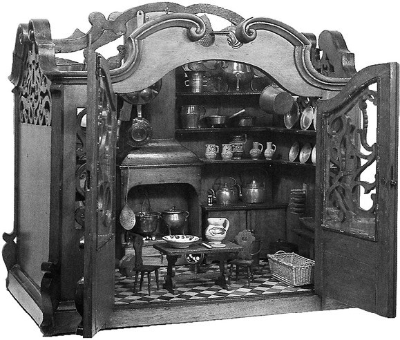 Дизайн некоторых кухонь был целиком подчинен внешней привлекательности, даже в ущерб правдоподобию. Как правило, кухни были прямоугольными: боковые стенки крепились к задней под прямым углом. Но у некоторых кухонь эти углы были скошены . Были и такие, у которых боковые стенки расширялись наружу, что делало их еще более похожими на театральные декорации. Это давало лучший обзор всей находящейся там многочисленной утвари . В этом сходстве с театральной сценой, возможно, проявлялось аналогичное стремление обратиться к воображению зрителя и перенести его из «здесь и сейчас» в другое место. В самом деле, начиная с 1830 года в Германии и Австрии были очень популярны игрушечные театры с бумажными фигурками актеров, бумажными декорациями и сценариями для бессчетного количества пьес и опер. Такие игрушки издавали шестьдесят три различных издательства .
