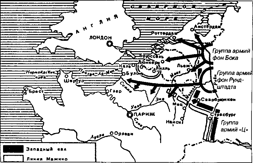 Сутью плана «серповидного разреза» было стремление косым (в отличие от прямого наступления на Париж) ударом отрезать британские и бельгийские части от левого (французского) фланга союзников. Все думали, что Арденны не годятся для крупных танковых операций, и первоначально немецкий Генштаб планировал удар через Льеж и Намюр по направлению к морю это также было повторением плана Шлиффена, так и не реализованного в Первую мировую войну.