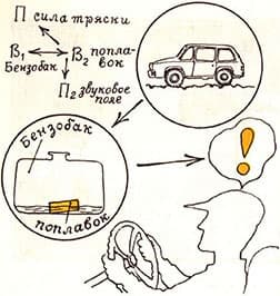 Итак, в вепольной форме задача решена. Остается уточнить: что такое В2 и П. Поле должно действовать на человека; значит, оно может быть электромагнитным (оптическим), механическим (звуковым) или тепловым. Оптическое поле неудобно: дополнительные оптические сигналы будут отвлекать водителя. Еще неудобнее сигналы тепловые. А звуковые? Теперь понятна роль В2. Это вещество, когда бак пустеет, должно взаимодействовать с ним, создавая звуковой сигнал. Задача решена! Бросим в бак какой-нибудь поплавок. Пока в баке есть бензин, поплавок плавает «молча» (боковые стороны поплавка должны быть мягкими, чтобы поплавок не стучал о стенки бака).