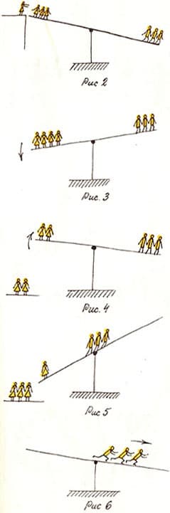 Используем метод моделирования маленькими человечками. На качелях девочки (жидкость) и мальчики (противовес в правой части дозатора). Вот принят «груз» (рис. 2), и левая часть качелей пошла вниз (рис. 3). Но как только спрыгнули одна-две девочки, левая часть качелей уходит вверх (рис. 4). Как сделать, чтобы все девочки успевали спокойно сойти с качелей? Ответ очевиден: пока девочки будут сходить, мальчики должны подвинуться к центру качелей (рис. 5), а потом вернуться в исходное положение (рис. 6).