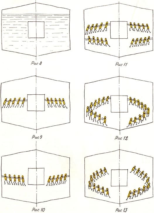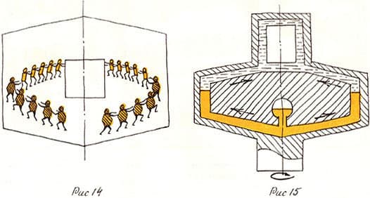 Применим метод ММЧ. Физическое противоречие: по условиям задачи «человечки-жидкость» должны давить на изделие (рис. 9), а по законам физики они обязаны давить в противоположную сторону (рис. 10). Будем действовать по обычной нашей логике: совместим несовместимое. Пусть одновременно происходят два противоположных действия (рис. 11). К сожалению, человечки давят только на стенки; давления на изделие нет. Значит, давление на стенки надо «перевернуть» (рис. 12). Но как это сделать? Если мы столкнем одну шеренгу человечков с другой, давление просто нейтрализуется (рис. 13). Как при соревнованиях по перетягиванию каната, когда силы команд равны Впрочем, ничто не мешает нам поставить в нижнюю шеренгу более сильных (более массивных) человечков (рис. 14). Вот и ответ! Пусть в сосуде будут две разные жидкости, например ртуть и масло (рис. 15). При вращении сосуда давление ртути пересилит давление масла и заставит масло давить на изделие. Красивое решение казалось бы совершенно нерешимой задачи