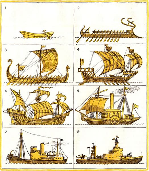 Вспомним историю корабля. Первые корабли приводились в движение веслами. Сначала строили корабли с одним рядом весел, потом покрупнее с веслами в два, три, четыре ряда В Древнем Риме однажды соорудили корабль с тридцатью рядами весел! Гребцам было трудно согласованно работать веслами. Да и сами весла стали очень тяжелыми: расстояние от верхних рядов до воды превышало двадцать метров.