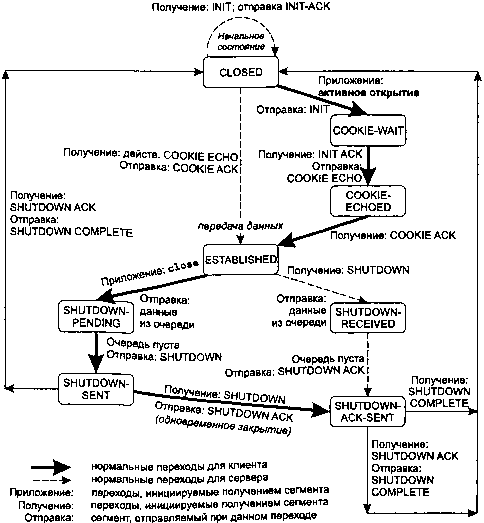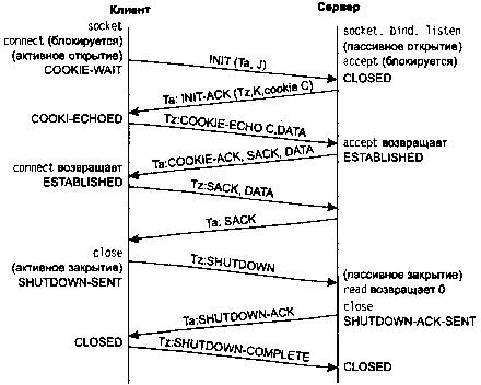 Как и на рис. 2.4, переходы из одного состояния в другое регулируются правилами SCRIPT и определяются текущим состоянием и порцией данных, полученной в этом состоянии. Например, если приложение выполняет активное открытие в состоянии CLOSED (Закрыто), SCRIPT отправляет пакет INIT и переходит в состояние COOKIE-WAIT (Ожидание cookie). Если затем SCRIPT получает пакет INIT-ACK, он отправляет пакет COOKIE-ECHO и новым состоянием становится COOKIE-ECHOED (Cookie отправлен обратно). Если после этого SCRIPT принимает COOKIE ACK, он переходит в состояние ESTABLISHED (Соединение установлено). В этом состоянии осуществляется передача основного объема данных. Порции данных могут передаваться совместно с пакетами COOKIE ECHO и COOKIE ACK.