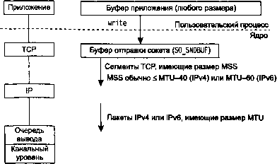 TCP отправляет данные IP порциями размером MSS или меньше, добавляя свой заголовок TCP к каждому сегменту. Здесь MSS это значение, анонсированное собеседником, или 536, если собеседник не указал значения для MSS. IP добавляет свой заголовок, ищет в таблице маршрутизации IP-адрес назначения (соответствующая запись в таблице маршрутизации задает исходящий интерфейс, то есть интерфейс для исходящих пакетов) и передает дейтаграмму на соответствующий канальный уровень. IP может выполнить фрагментацию перед передачей дейтаграммы, но, как мы отмечали выше, одна из целей параметра MSS не допустить фрагментации; а более новые реализации также используют обнаружение транспортной MTU. У каждого канального соединения имеется очередь вывода, и если она заполнена, пакет игнорируется, и вверх по стеку протоколов возвращается ошибка: от канального уровня к IP и затем от IP к TCP. TCP учтет эту ошибку и попытается отправить сегмент позже. Приложение не информируется об этом временном состоянии.