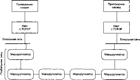 Рис. 1.4. Клиент и сервер в различных локальных сетях, соединенных через глобальную сеть