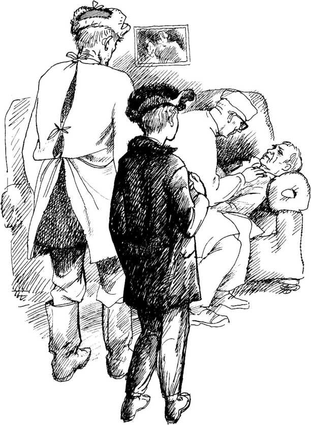 От волнения мальчик сжимает в карманах кулаки. Врач берет Бахтюкова за руку. Он считает удары пульса, поглядывая на часы. Раз считает, значит, пульс есть. Значит, Бахтюков жив. Хотя он не очень похож на живого. Врач засучивает рукав больного до самого плеча и берет ампулу. Ампула похожа на маленькую сосульку. Врач щелкает сосульку по носу и ловким ударом отбивает стеклянный кончик. Потом опускает туда стальное жало шприца. Берет руку человека, лежащего без сознания, и прикидывает, куда бы вонзить иглу. Мальчик упирается большими пальцами ног в носки ботинок.