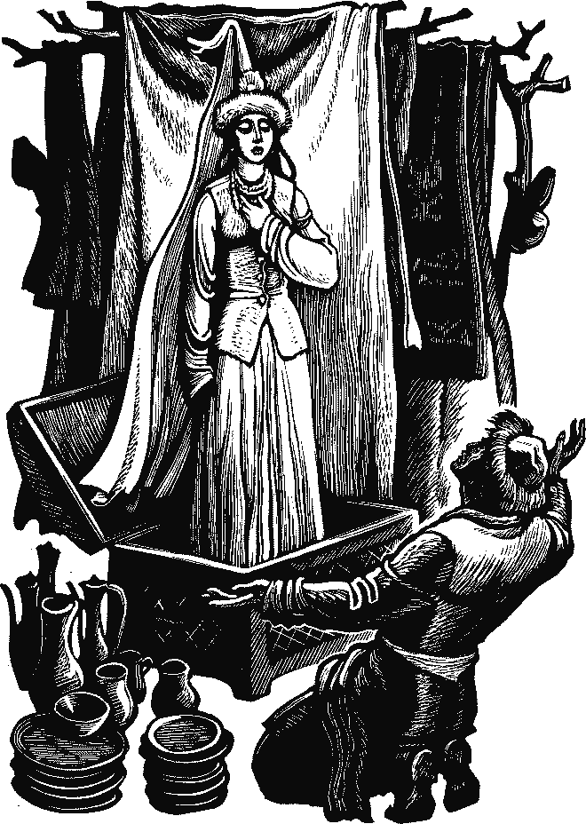 Шакирет отдал ему своего верблюда и взял у старика сундук. Понес его к себе, а когда открыл, из сундука вышла такая красивая девушка, что ее можно было сравнить только с луной или с солнцем.