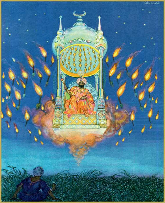 кроме невидимого ока Аллаха и дикой травы. И я сел и начал дожидаться с нетерпением того, что должно было со мною произойти. И я слышал, как будто вокруг меня летали ночные птицы, невидимые мною. И от страха одиночества уже начало трепетать сердце мое, и ужас ночи наполнял мою душу. И совершенно неожиданно я заметил на некотором расстоянии от меня большое число факелов, которые, казалось, сами собою двигались по направлению ко мне. И вскоре я мог различить руки, несущие их; но люди, которым принадлежали эти руки, оставались в сумраке ночи, и мои глаза не видели их. И бесчисленное множество факелов, несомых руками без собственников этих рук, прошли пара за парой передо мною. И наконец я увидел царя на троне, великолепно одетого и окруженного множеством огней. И, приблизившись ко мне, он взглянул на меня и начал всматриваться, тогда как колени мои дрожали от ужаса, и сказал мне: