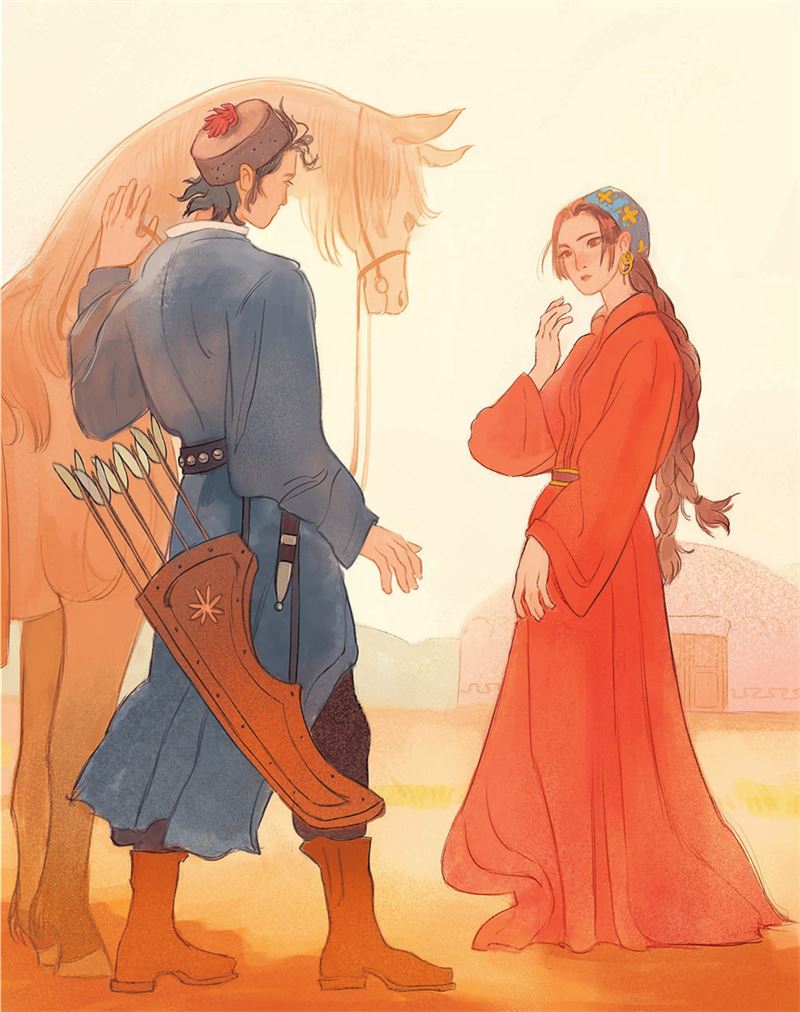 Вдруг к белой кибитке прискакал ханский сын, красивый и храбрый юноша в расшитом драгоценными камнями халате. Он возвращался со степной охоты на сусликов и, увидев Энкиру, застыл на месте от её красоты.