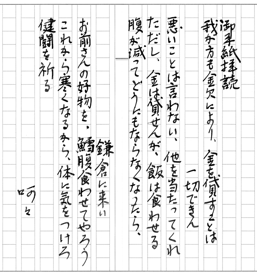 А начнешь совсем голодать приезжай в Камакуру. Деньгами не помогу, но накормлю до отвала чем только пожелаешь.