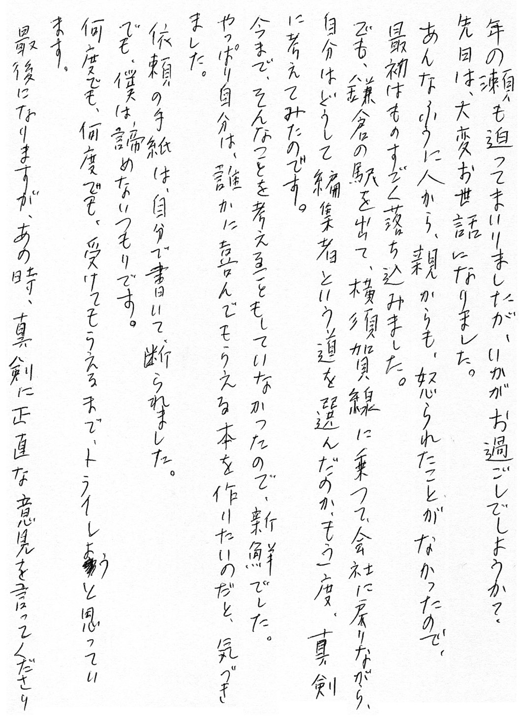За всю мою жизнь на меня так серьезно не сердился еще никто. Даже мои родители. Так что поначалу я жутко расстроился. Но, уже отъезжая с вокзала Камакуры обратно в издательство, снова задумался над Вашим вопросом: почему я вообще решил стать издателем?