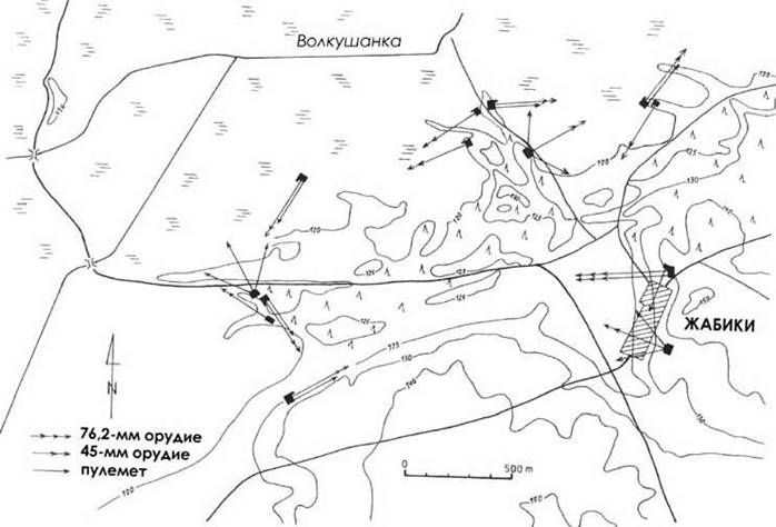 Относительно мало информации на данный момент имеется об оборонявших этот участок УР советских солдатах. Известно, что он находился в полосе обороны 56 стрелковой дивизии (по некоторым источникам 27 стрелковой дивизии). Занять доты должны были гарнизоны из состава 10 отдельного артиллерийско-пулеметного батальона (командир капитан Павел Цветков), который на момент начала войны еще был в стадии формирования. Строительством укреплений занимался 1 батальон отдельного саперного полка. Известно, что в боях под Жабиками участвовали солдаты этого батальона. Несколько офицеров этого подразделения могло воевать в дотах на северных окраинах деревни. Из всего вышесказанного ясно, что ни численность советских войск (которая никак не равнялась дивизии), ни накал боев не соответствуют тому описанию, какое приводит в своих воспоминаниях Хорст Слесина. Очевидно, он умышленно преувеличил и приукрасил ход событий в пропагандистских целях чтобы еще раз подчеркнуть мощь и боеготовность немецких войск. Тем не менее, это нисколько не уменьшает ценности предлагаемого текста, в котором довольно точно описана тактика прорыва укрепленной полосы и методика уничтожения отдельных дотов.