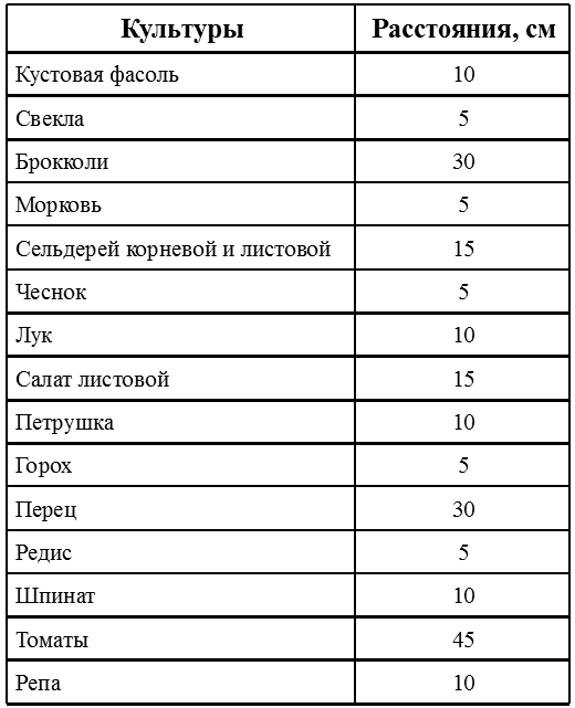 В табл. 18 приведены минимальные расстояния между расстояниями, но выдерживать их можно только на достаточно богатой и влажной почве. Такие уплотненные посевы лучше всего удаются с компактными растениями зеленных культур, небольших по размеру видов капусты, корнеплодов, перца, кустовой фасоли.