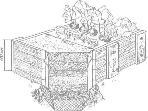 Выпуклые грядки устраивают следующим образом: делают на отведенной территории небольшое углубление, кладут на дно проволочную сетку, которая защитит огородные культуры от мышейполевок, затем насыпают слой измельченной древесины (щепы и стружки), образующий «начинку» грядки. Сверху укладывают толстым слоем растительные остатки и прелую листву, затем полузрелый компост, смешанный с садовой землей.