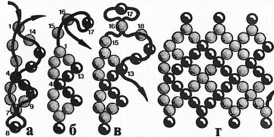Иголку с ниткой протягиваем через последнюю бисеринку ряда 7 и притягиваем нитку. Набираем 2-й ряд из двух петель по три бисеринки и нижем его снизу вверх. Для первой петли набираем бисеринки 810, протягиваем нитку через бисеринку-связку 4 1-го ряда и притягиваем нитку (рис. 30, б). Затем набираем вторую петлю из трех бисеринок (1113) и протягиваем нитку через бисеринку 1 первого ряда (рис. 30, в). Заканчиваем 2-й ряд затягиванием рабочей нитки и набираем первую петлю 3-го ряда (1416). Нижем его сверху вниз, протягивая иголку с ниткой через среднюю бисеринку 12 на второй (последней) петле 2-го ряда. Затем набираем вторую петлю 3-го ряда (1719) и протягиваем нитку через среднюю бисеринку 9 первой петли 2-го ряда (рис. 30, г). Притягиваем рабочую нитку и заканчиваем 3-й ряд двумя бисеринками (20, 21) и подвеской (рис. 30, д). 4-й ряд нижем снизу вверх, как и 2-й, из двух петель по три бисеринки, пропуская рабочую нить в средние бисеринки-связки 18 и 15 предыдущего ряда (рис. 30, е). 5-й ряд нижем, как 3-й, 6-й как 2-й и 4-й. Так работаем до получения необходимой длины изделия, не забывая, что в конце каждого нечетного ряда набираем только две бисеринки и какое-то количество на подвеску (рис. 30, ж, з).