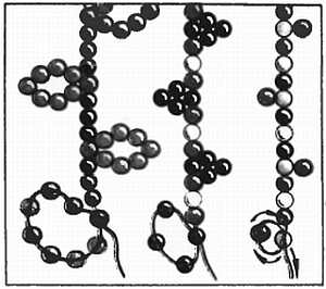 Пупырышки. На вощеную нитку необходимой длины набираем ряд одноцветных бисеринок и 16 бисеринок другого цвета. Иголку с ниткой пропускаем через предпоследнюю бисеринку ряда или через первую цветную бисеринку и притягиваем нитку. Получается пупырышек или петелька, украшающие нитку бус (рис. 4). В такой же последовательности нижем всю длину нитки.