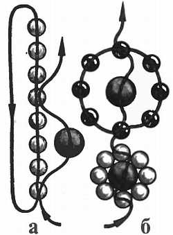 Цепочка колечки. Из шести бисеринок нанизывают первое колечко, а второе и все последующие, набирая на правую нитку три, а на левую две бисеринки (рис. 13).