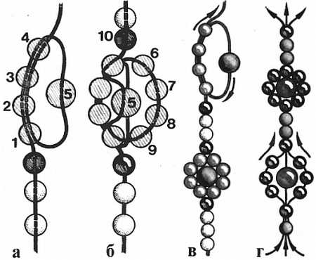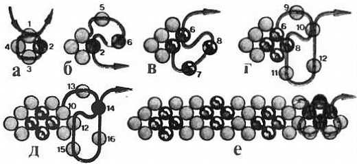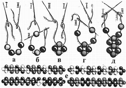 а-д последовательность выполнения; е варианты узоров в зависимости от цвета бисера