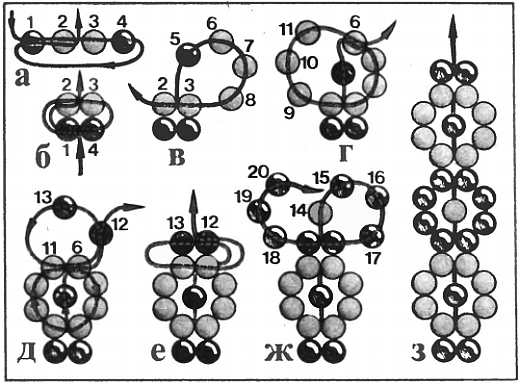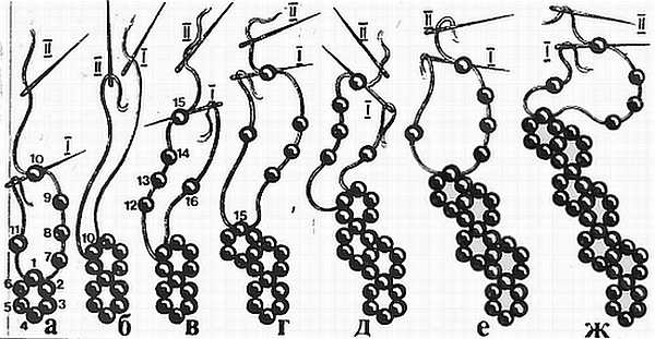 1 через последнюю бусинку (10) на нитке II (рис. 15, а, б). Для третьего колечка набирают четыре бусинки (1215) на иголку II и одну (16) на иголку I, протягивая иголку I в последнюю (15) бусинку на нитке с иголкой II (рис. 15, в, г). Притягивают нитки и набирают четвертое кольцо и все последующие по схеме (рис. 15, д-ж). Такие цепочки делают из мелких круглых бус одного или нескольких цветов, следя за правильным набором их на нитки.