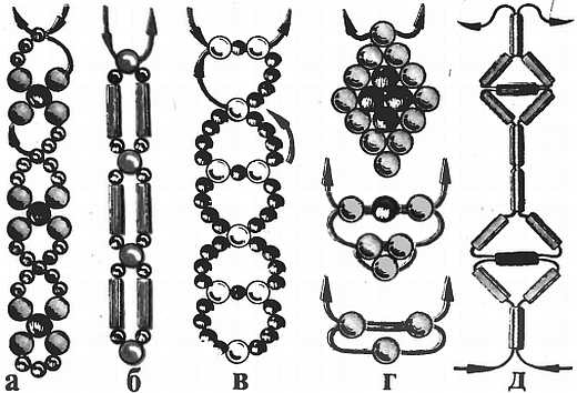 Увеличивая количество бусинок в колечке, добавляя бусы и стеклярус, можно сделать множество самых разнообразных цепочек (рис. 14, а-в). Таким же способом нижутся и ромбики, которые в народе называют лодочками (рис. 14, г, д)
